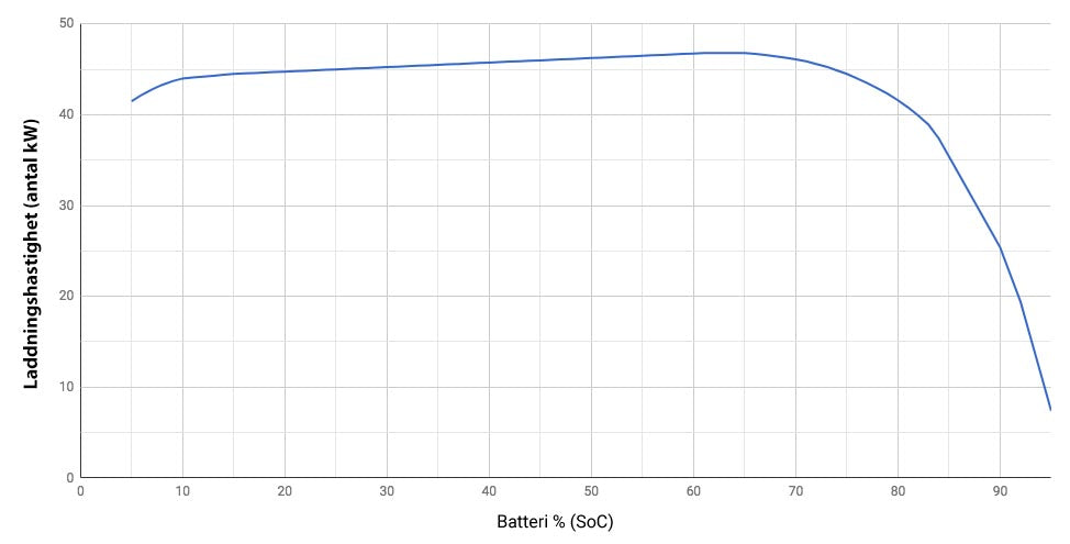 Grafen nedan visar ett exempel på en laddningskurva, med laddningshastighet uttryckt i kW (vertikal axel) och hur fullt batteriet är i procent (horisontell axel).